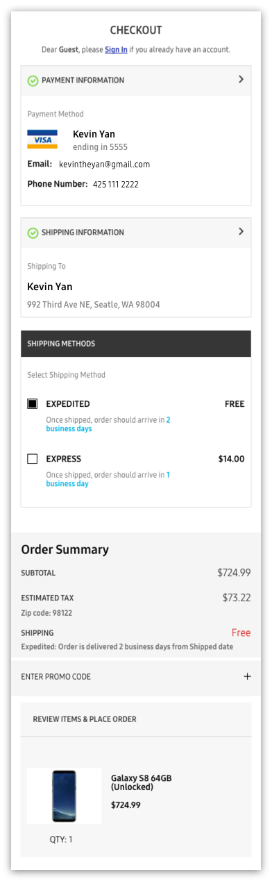 There are a few improvements I would have liked to explore. Despite our best attempts at mitigation, the checkout process can get very lengthy on mobile. Ideally, we would have been able to design a few different UIs and conducted user testing. Purchasing a product should be an exciting moment for our users, as they're spending their hard earned money on what is most likely a very expensive electronic. I believe that we could have done more to capitalize on this and engage the user in our design.