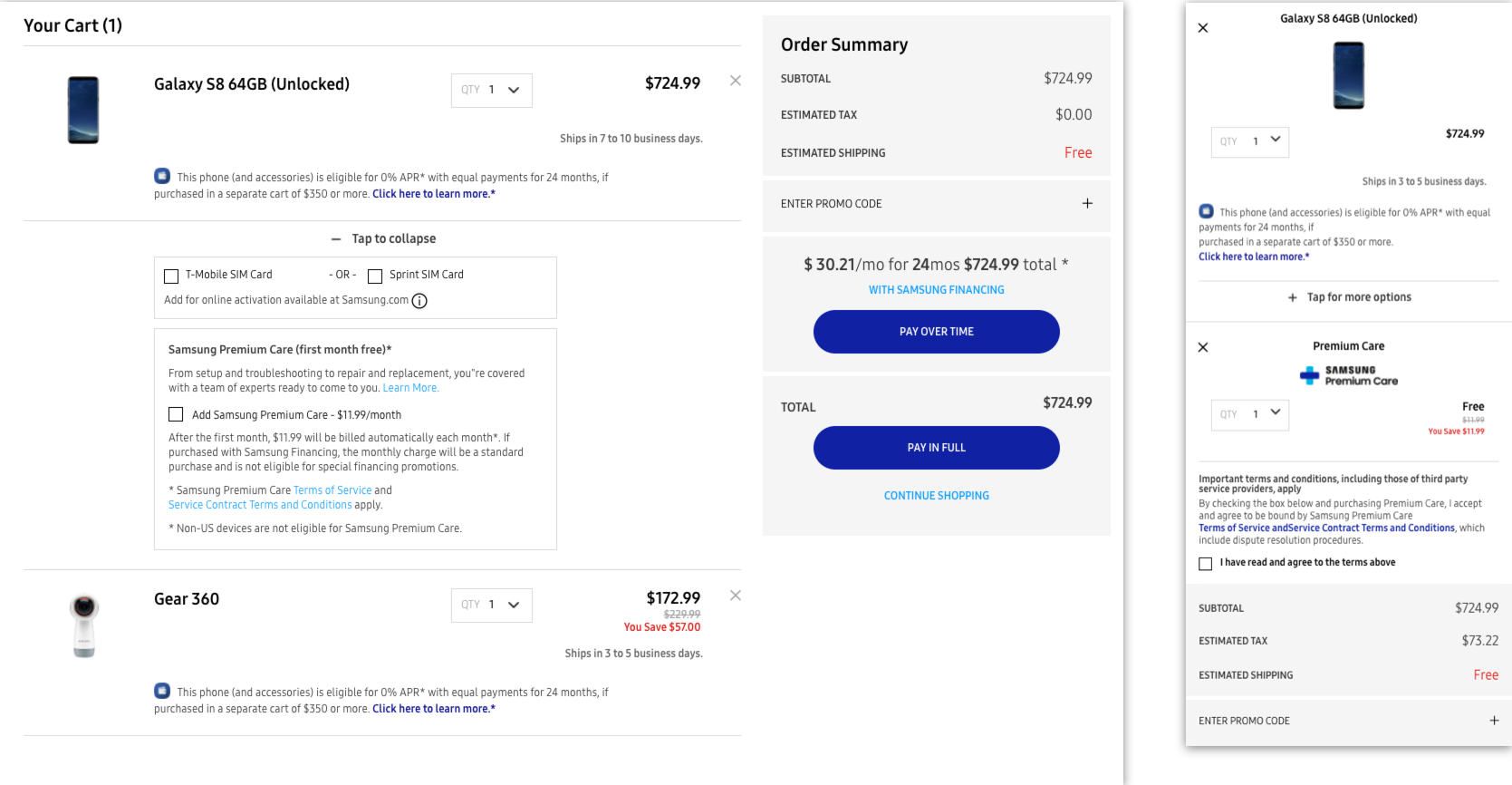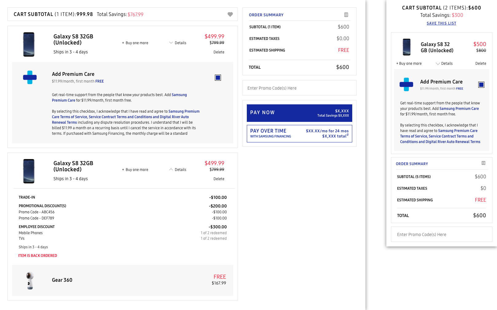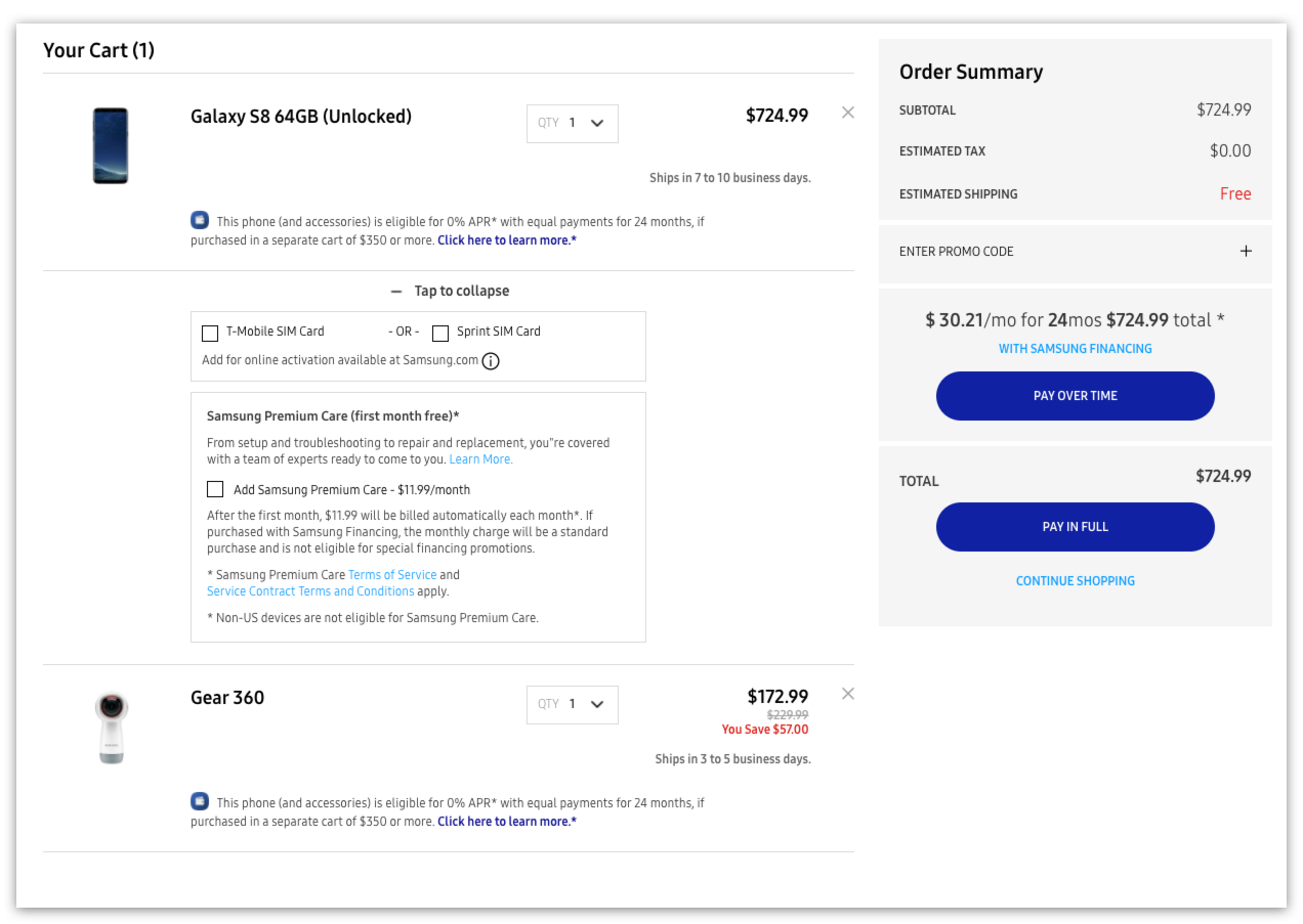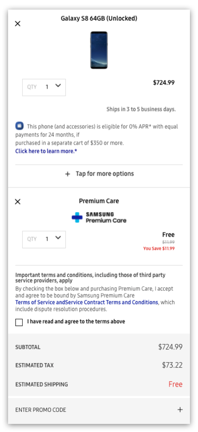 Samsung's old cart and checkout experience had a hard time converting customers, and it wasn't difficult to see why. Aside from the outdated feel, the overall experience completely buckled when handling multiple line items and add-ons.