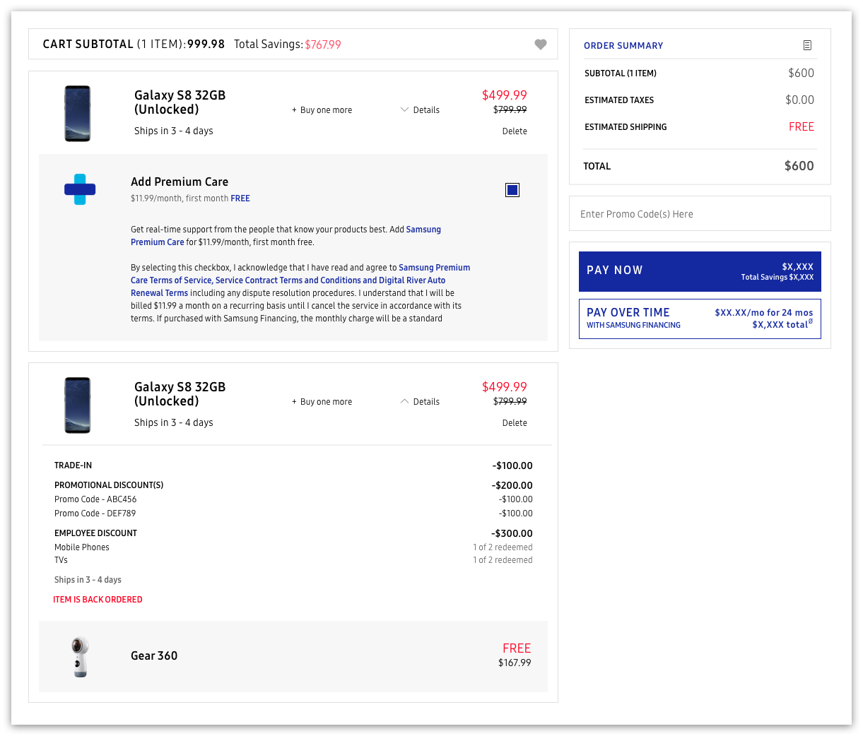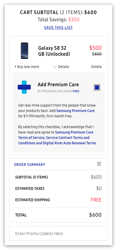 For example, if a user's cart held multiple parent items (such as Galaxy S8s) and multiple child items (such as Premium Care coverage or a bundle deal), there was no easy way to distinguish which child item belonged to which parent. As a business that is constantly pushing out BOGOs and special programs across all product families, Samsung needed a solution built to handle complex orders. This demand for flexibility and clarity laid the foundation for our redesign.