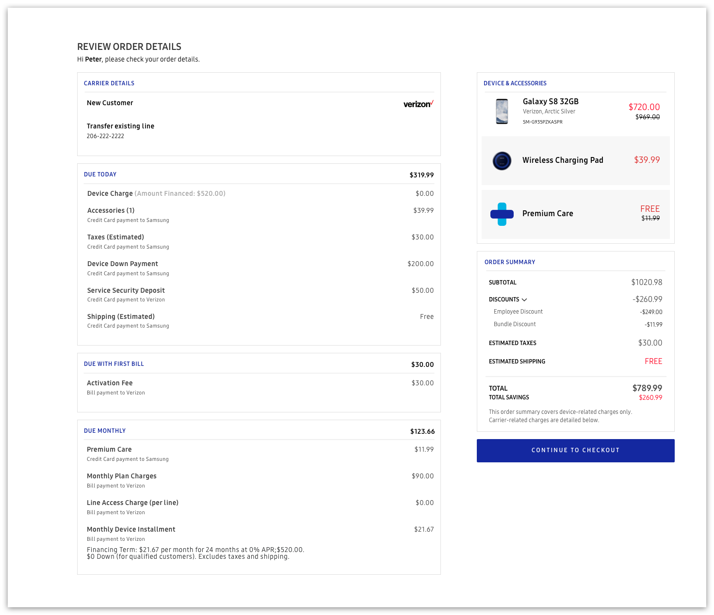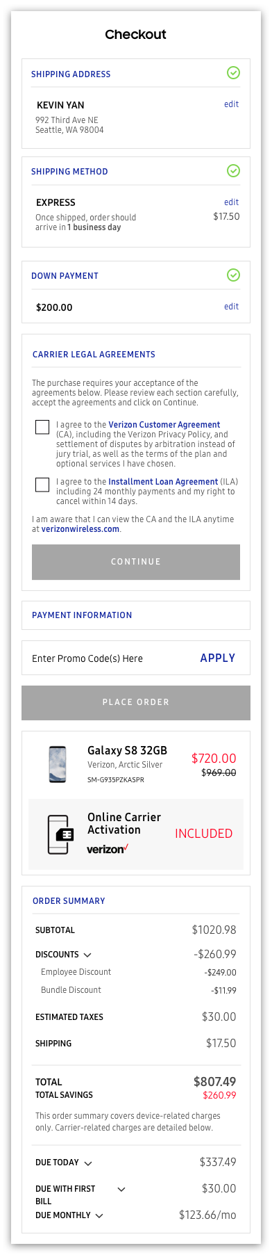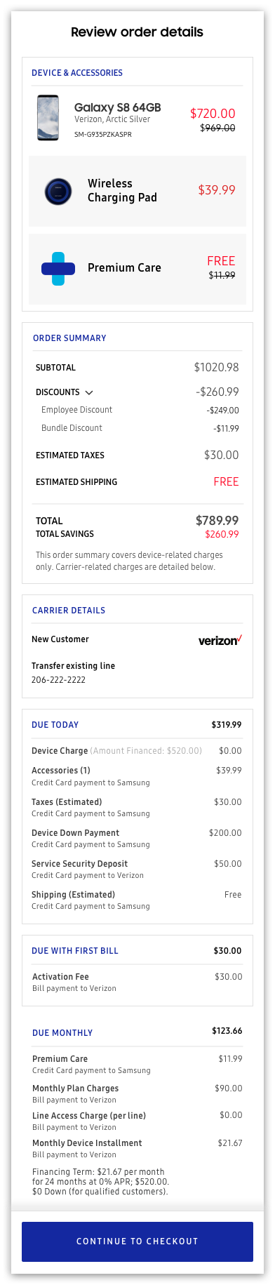 Our foresight paid off several months later. When Samsung launched a program to allow customers to activate their new Galaxy devices through Samsung.com, we exposed the checkout to several huge design demands. These issues included bills due at time of payment, bills due after the first week, monthly bills, down payments, and legal agreements. It was a real stress test that would determine just how adaptable our solution could be.