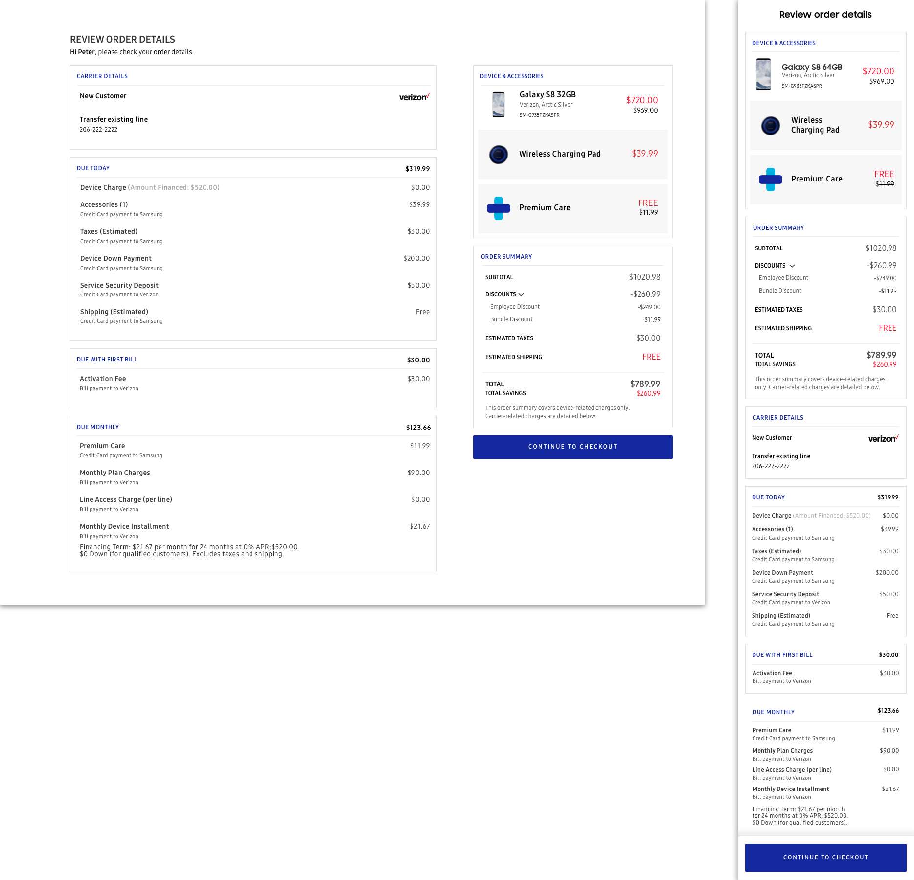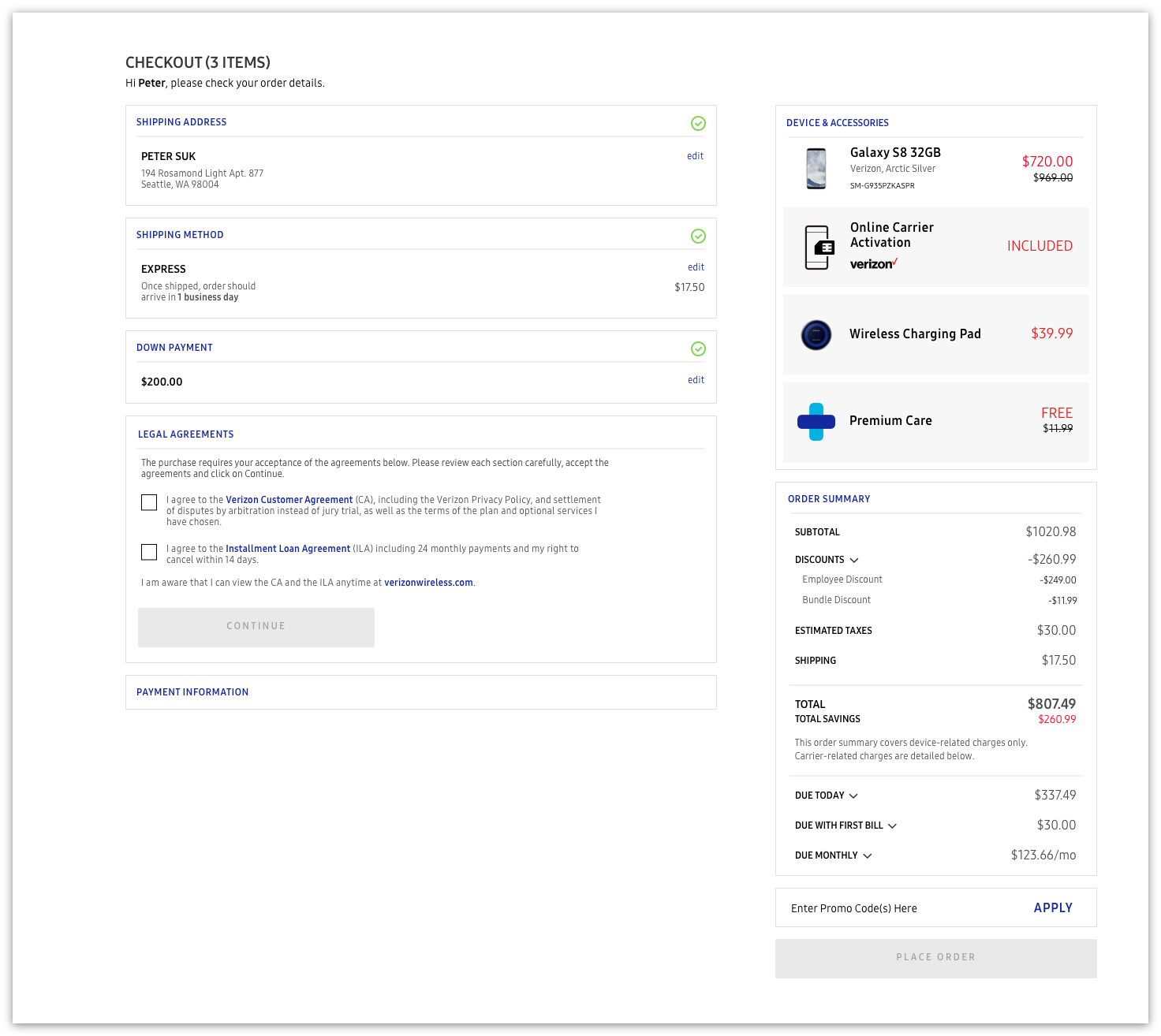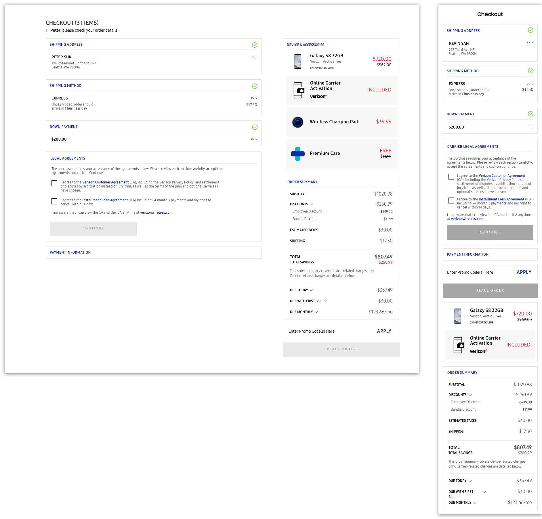 The redesigned checkout handled the carrier activation with no issue, demonstrating the flexibility that we prioritized so much during inception. The new down payment and legal agreement sections fit right into the page as new modules, keeping the flow easily digestible from end to end. The three bills are slotted in right beneath the total price; even though we handled the bill summary on the previous page, the down payment can affect the pricing and users are still expected to confirm their spending all the way up until purchase.