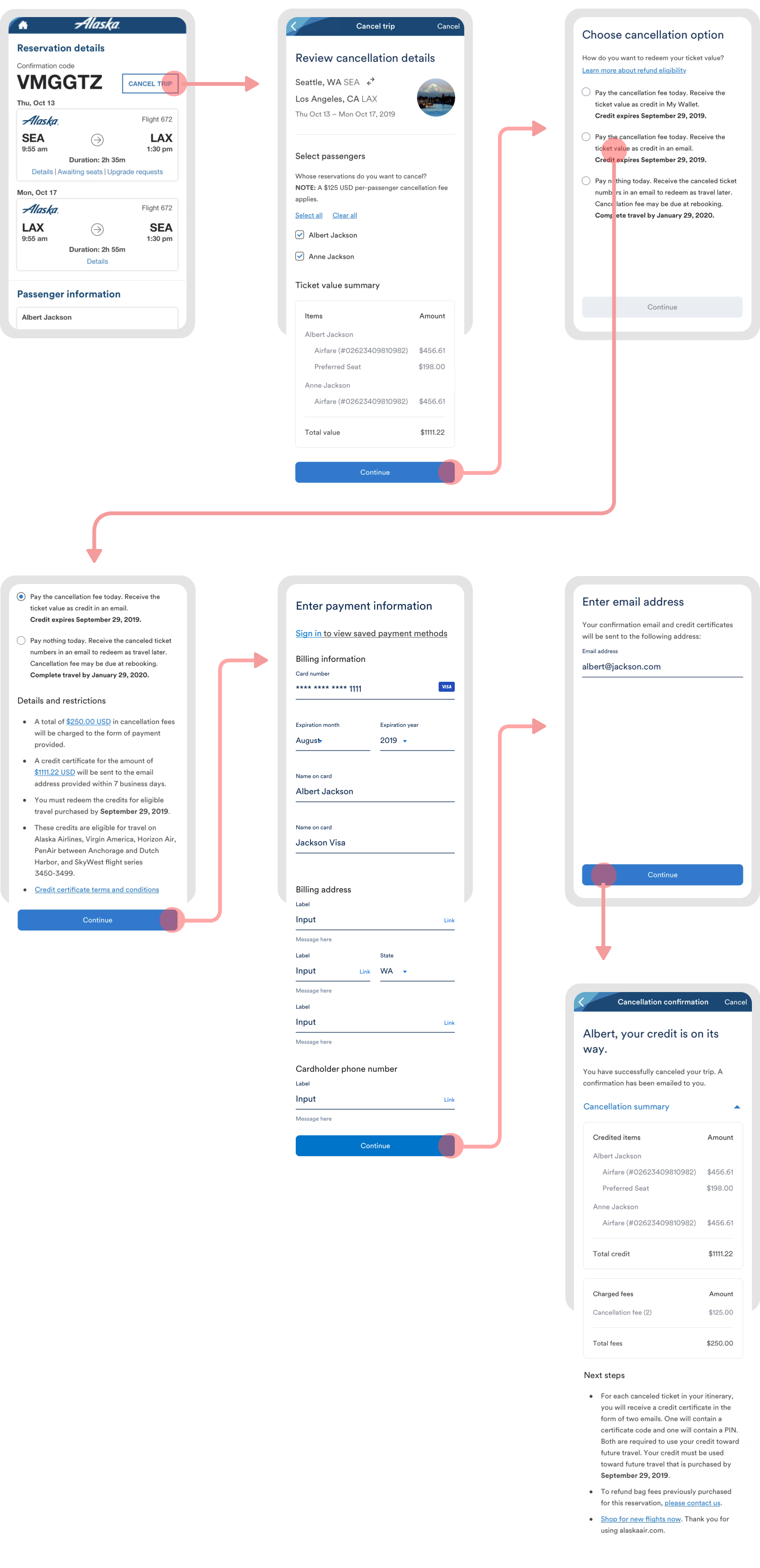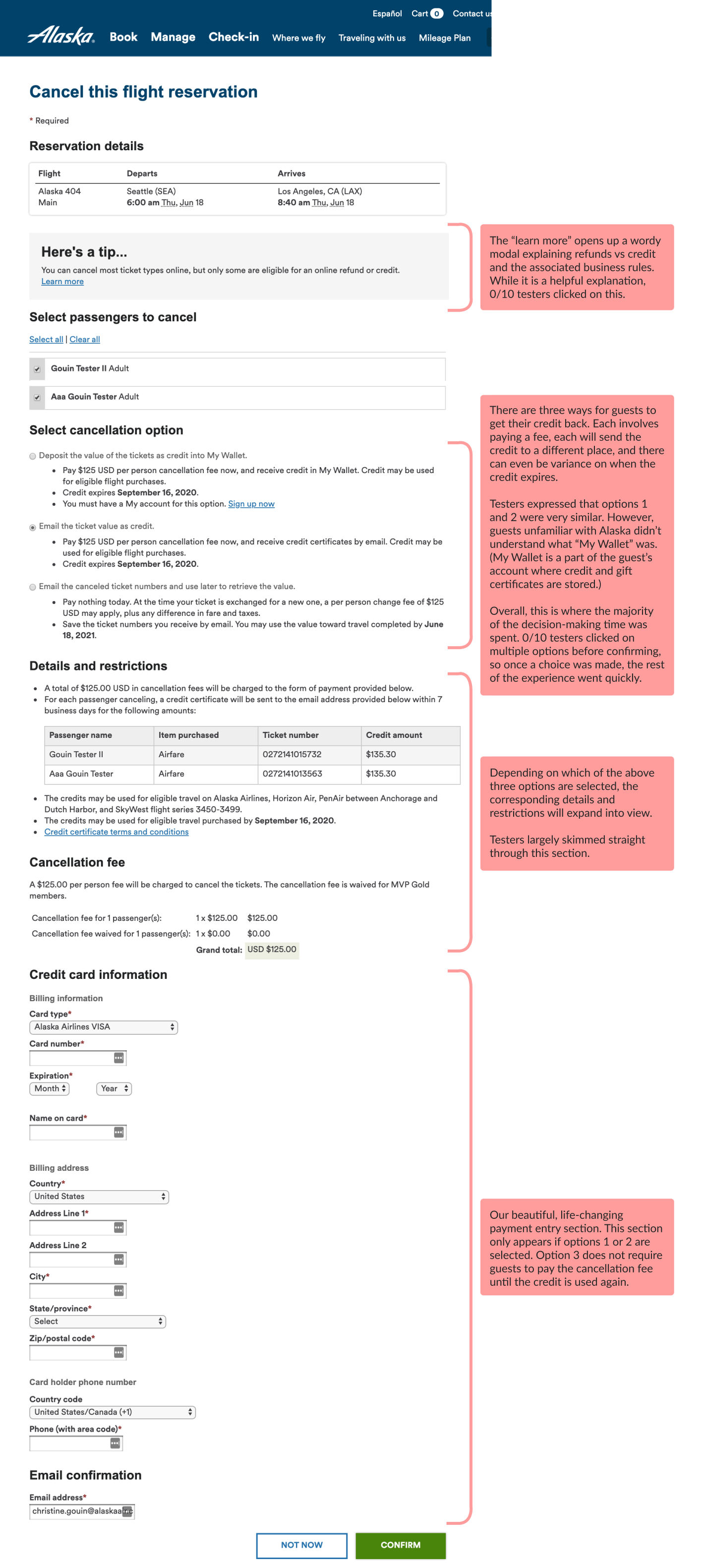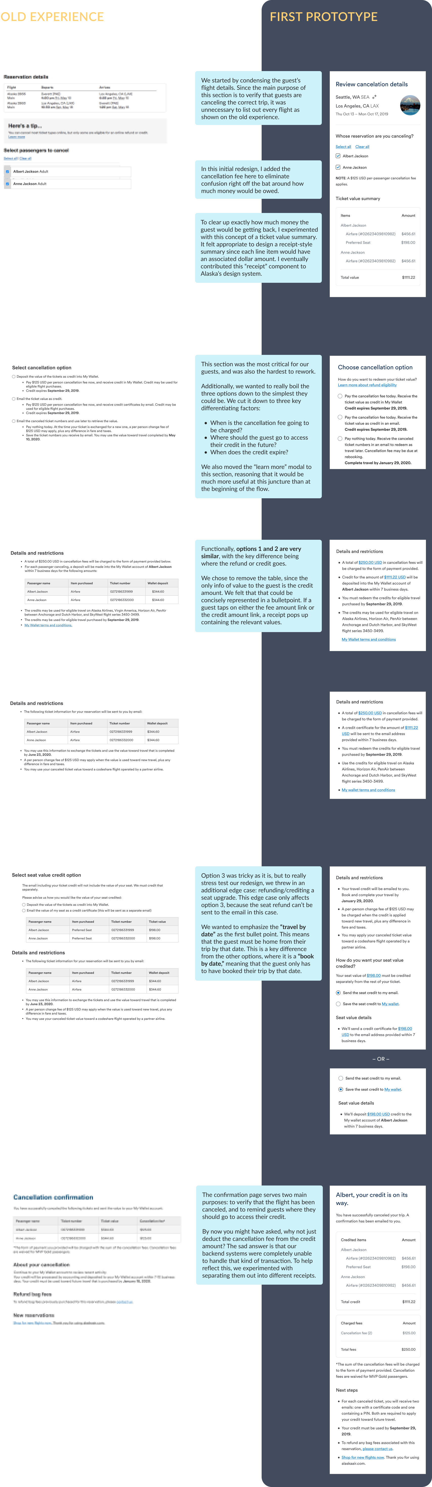 Another crucial starting step was to simply learn the different variations and business rules of our cancelation process. The above experience was only one of seven different states the guest could see depending on if their ticket was fully refundable, whether or not they bought with miles, if they had upgraded their seat, the list goes on. For the purposes of this case study, I'll be focusing on the most common yet still complex scenario: where we cannot give a full refund, and can only give Alaska travel credit.