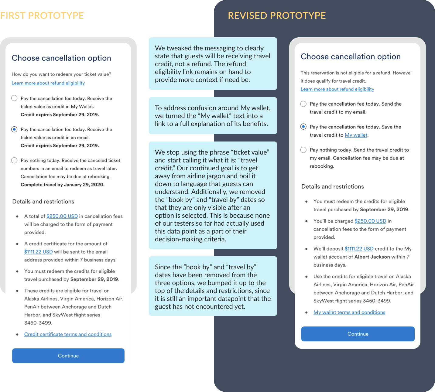 In this second loop, our goal was to test if participants recognized they would be receiving credit instead of a full refund. As before, we also made sure to test their understanding of the three cancellation options overall. Here's our feedback: