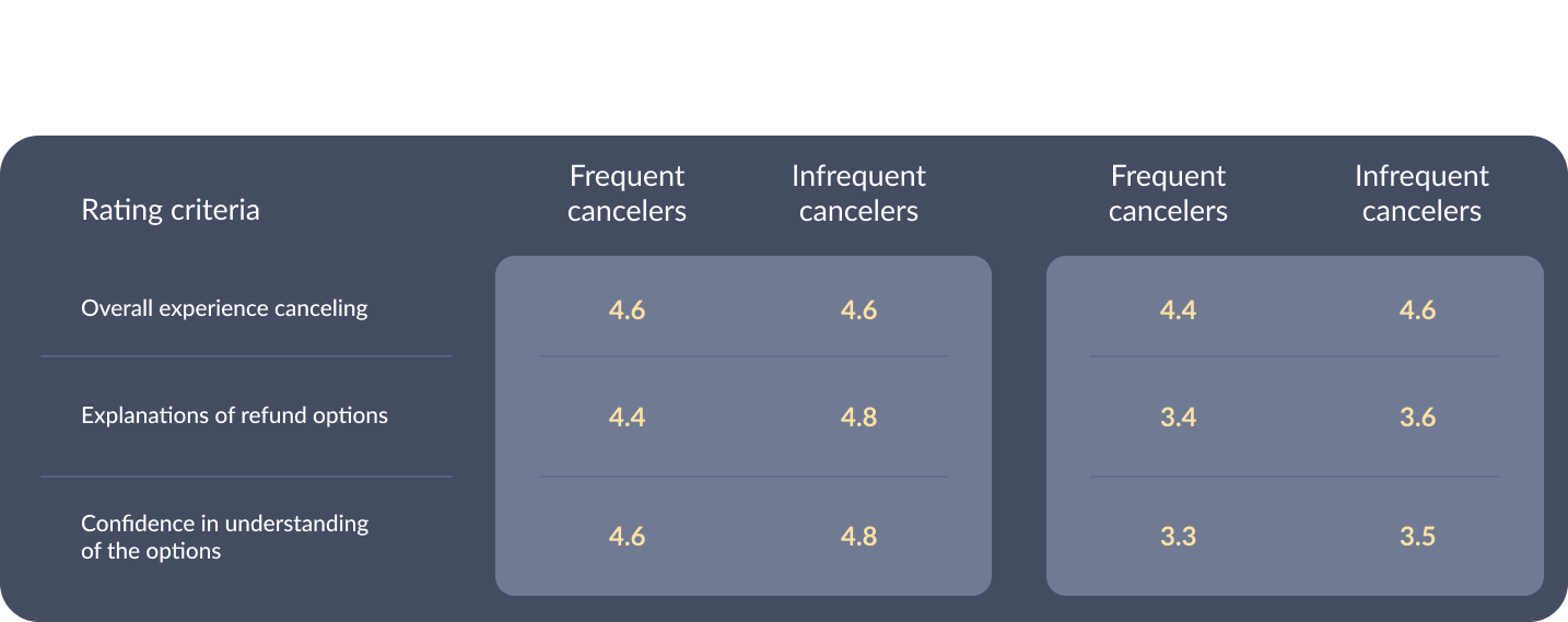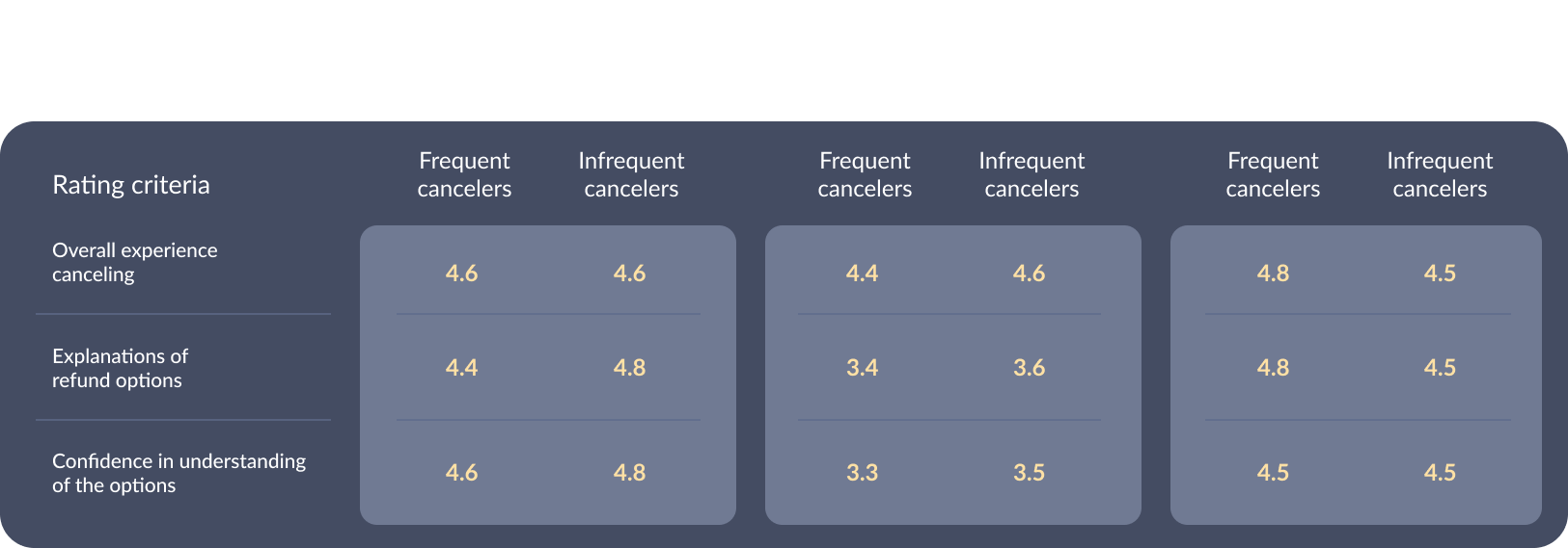 We also asked our participants to rate their overall experience canceling, the refund option explanations, and their confidence in their understanding of the options.