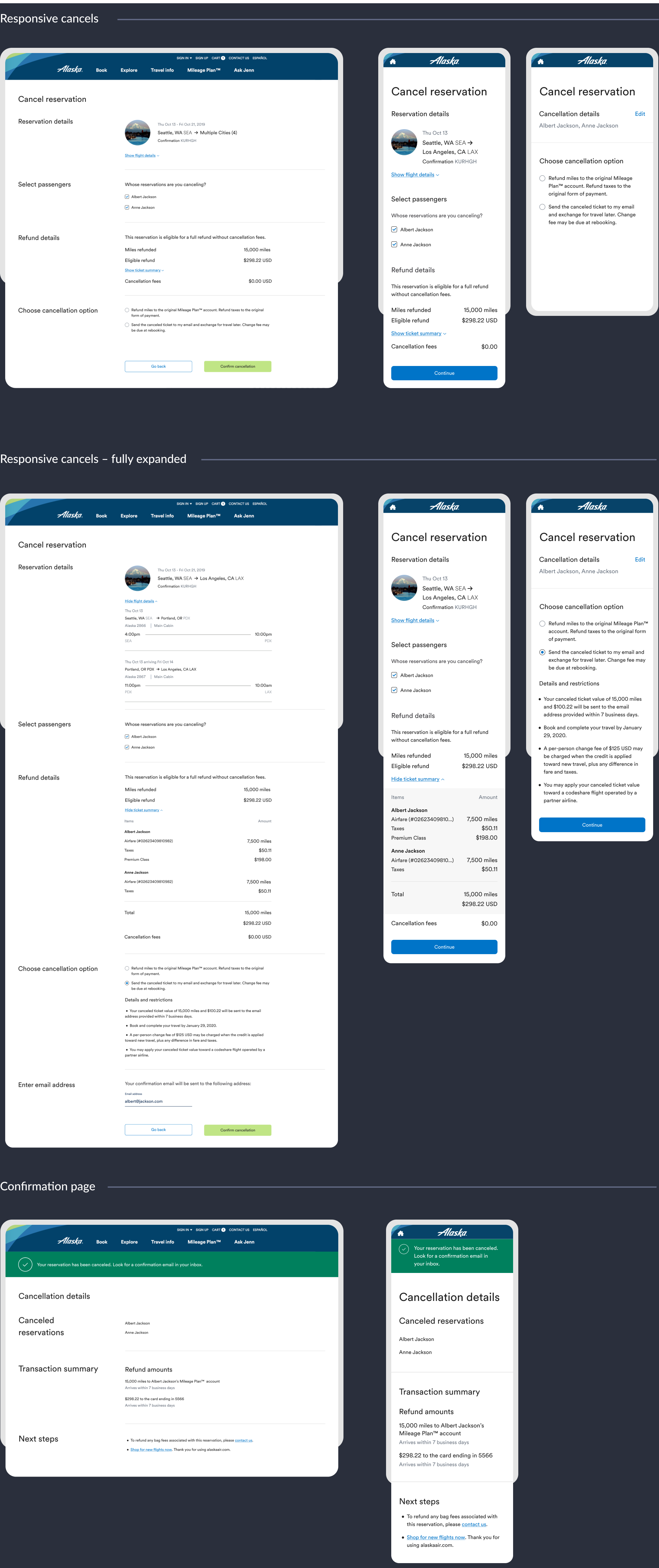 Alaska's responsive cancels experience launched on desktop, mobile web, iOS, and Android throughout Q2 2019 with further use cases following in Q3. It was fully complete just in time to process hundreds of thousands of cancelled reservations due to the COVID-19 pandemic.